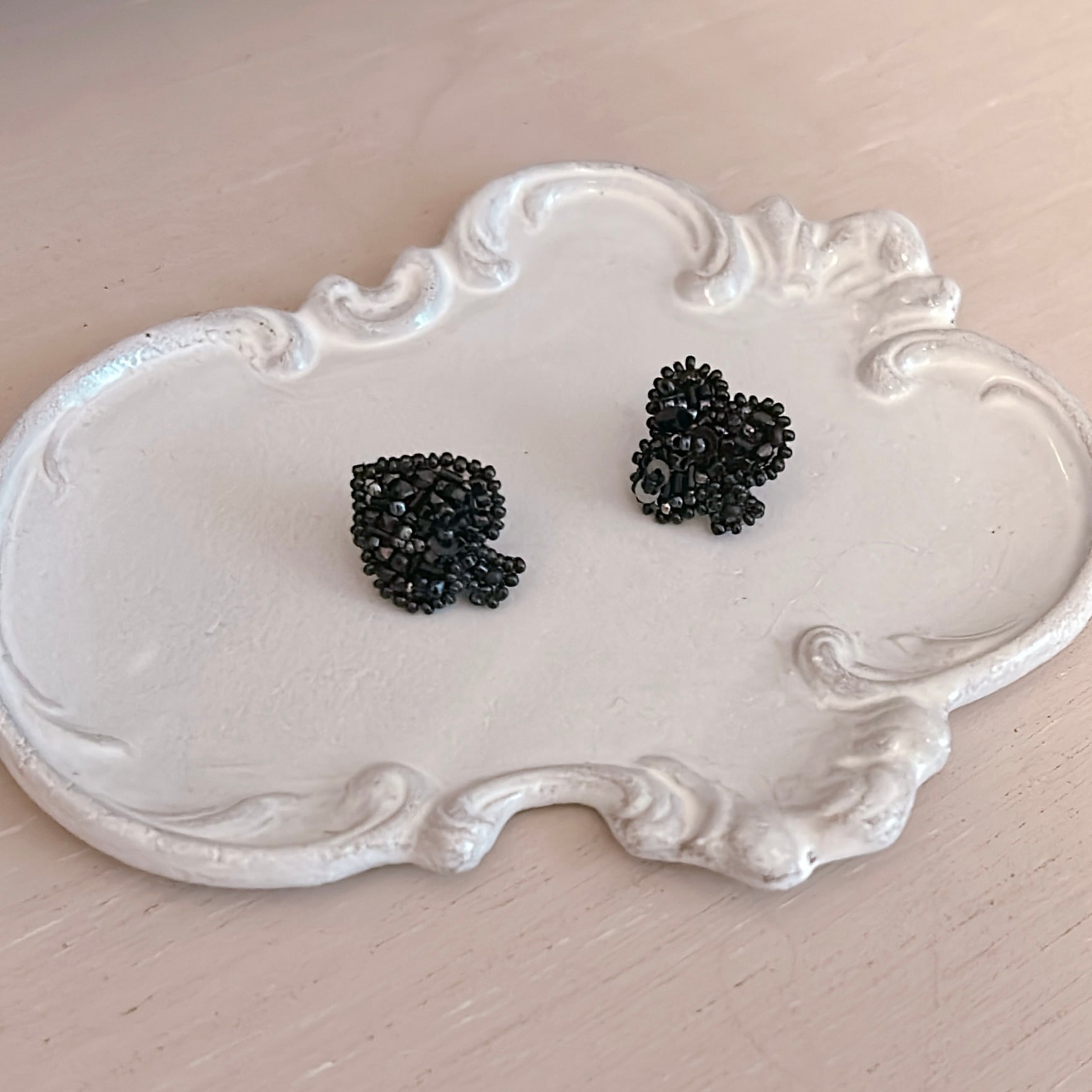 スペードとクローバーをモチーフにした、遊び心満載のピアスです。手刺繍で丁寧に仕上げられたデザインは、個性的でありながらも華やかな印象を与えます。